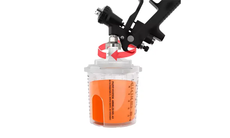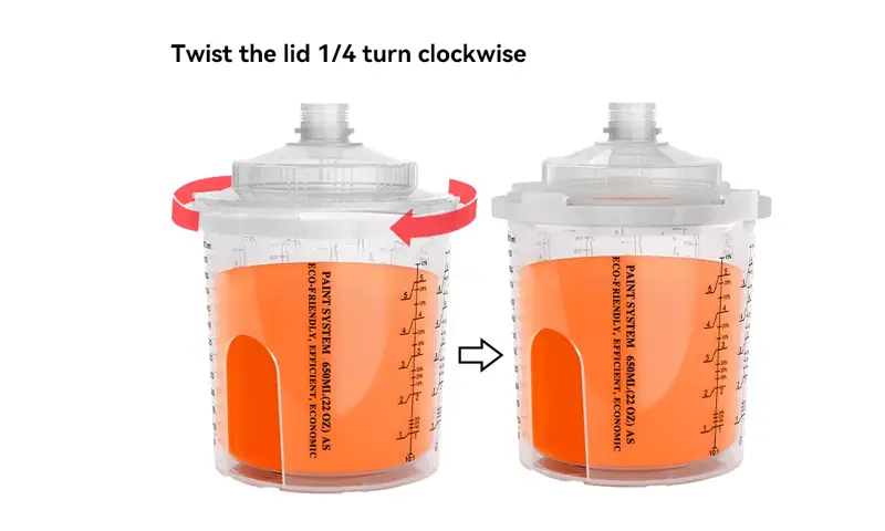 Atrakinkite sistemą, pirmiausia paspauskite pistoletą į apačią ir prieš laikrodžio rodyklę pasukite, kol adapteris bus nemokamas; Antra, tęskite pasukdami, kol dangtis visiškai laisvas nuo išorinio puodelio spynų, tada atjunkite purškimo pistoletą.