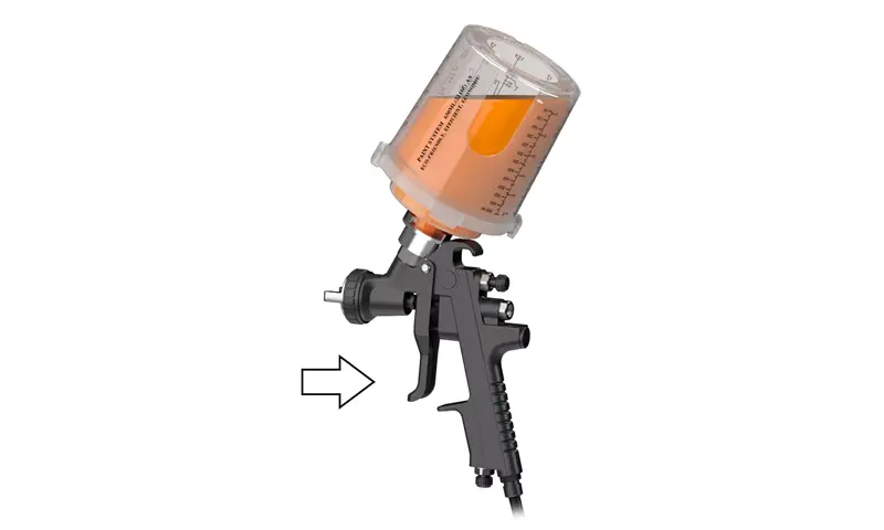 LF yra likusių dažų, užklijuokite juos kamščiu, apverskite purškimo pistoleto puodelį ir saugokite jį ateityje naudoti