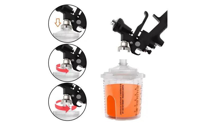 Pritvirtinkite purškimo pistoletą prie ir purškimo pistoleto taurės. Užrakinkite jį vietoje