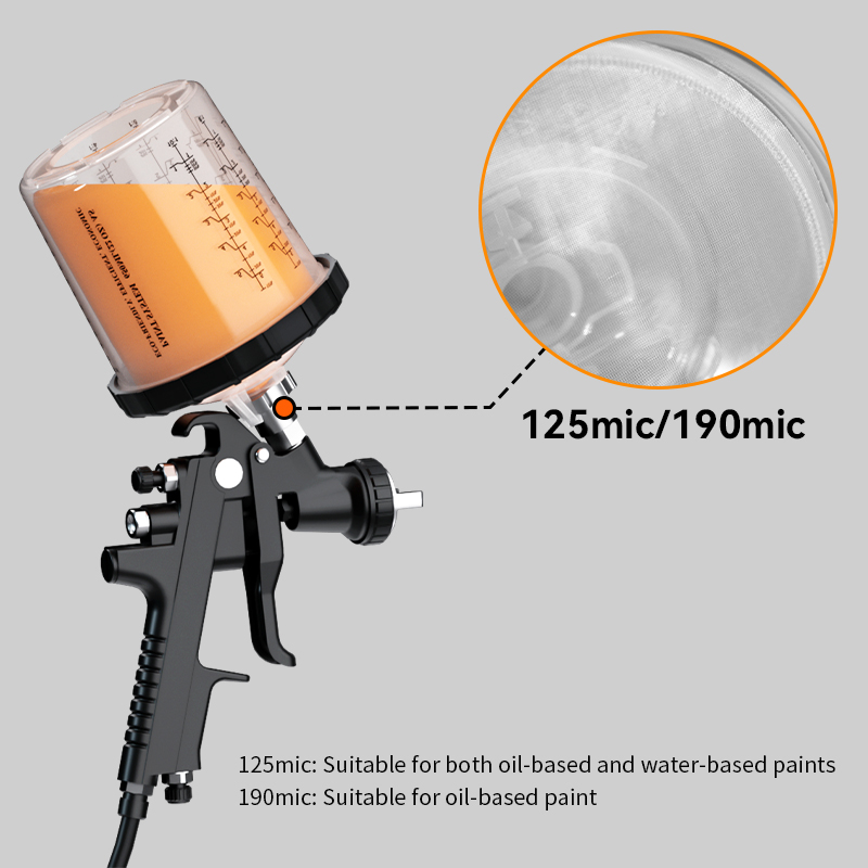 • Integruoti integruoti filtrai puikiam dažų apdailai: Vienkartinio purškimo puodelio dangtelyje yra įmontuoti 190μ (aliejiniai dažai) ir 125μ (vandeniniai dažai) filtrai, efektyviai filtruojantys nešvarumus purškimo metu ir padidinantys dažų blizgesį 20%.